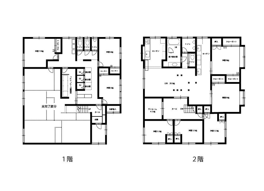 間取り 現状8部屋・キッチン3・トイレ総数5・シャワールーム3・バスルーム1+未完了部分あり